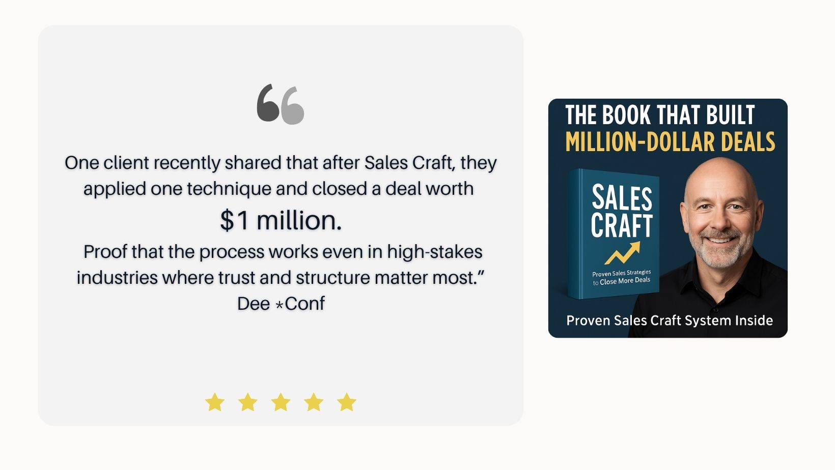 Once you grab your copy of Sales Craft, you’ll finally stop doing the things you hate, watching deals slip away, forcing weak conversations, or tripping over client objections, and instead start closing deals naturally while building lasting trust.